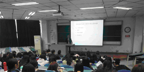 首先,金双军老师就审核评估期间专家对本系毕业论文所存在的问题及意见做了简要介绍。其次,英语专业高年级教研室主任袁才斌介绍了毕业论文写作过程中的注意事项,并提醒学生要注意论文写作期间各时间节点。最后,毕业论文指导教师与学生就论文选题、论文写作等方面做了一一交流。