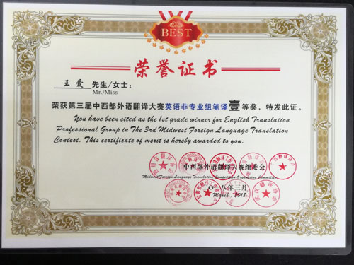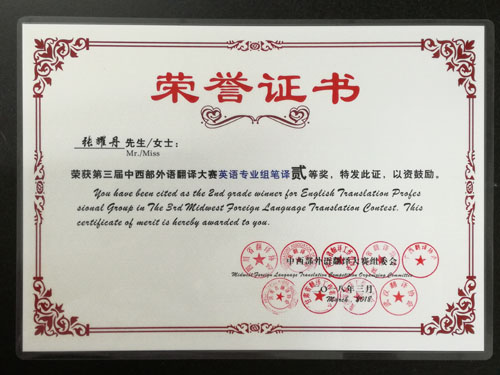 由四川、陕西、河南、广西、河北、贵州、甘肃、宁夏、武汉9省市翻译协会联合举办的“第三届中西部外语翻译大赛”结果日前揭晓,我校学生在决赛中收获了一等奖1名,二等奖6名,三等奖8名的优异成绩。